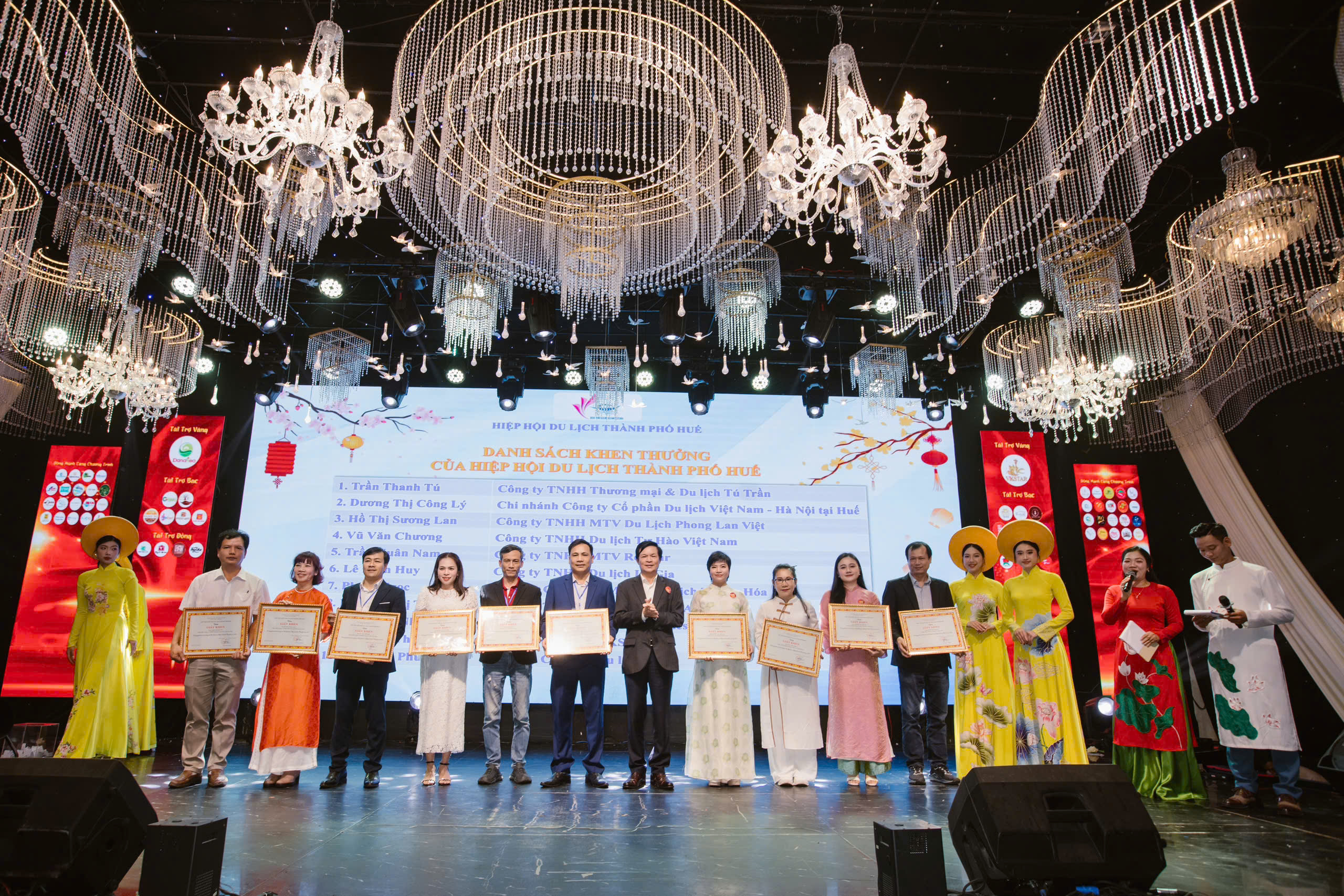 Representative of Vietnam Catholic Tours receiving the Certificate of Merit from the Hue City Tourism Association (woman wearing an orange Ao Dai)